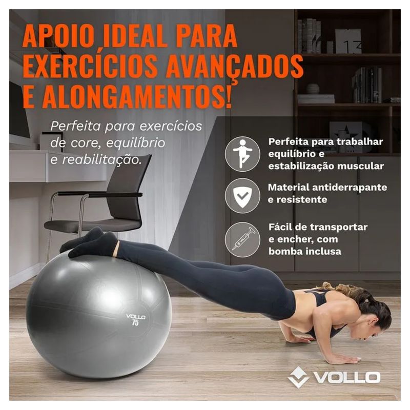 A Bola Suíça para Pilates e Yoga Gym Ball Vollo 75 cm com bomba é um equipamento versátil e indispensável para a prática de exercícios físicos, tanto em academias quanto em casa. Indicada para uma ampla variedade de atividades, auxilia no desenvolvimento da musculatura corporal, melhora a coordenação motora, o equilíbrio e a flexibilidade, além de contribuir para práticas como pilates, ginástica, yoga, alongamentos e tratamentos de fisioterapia. Produzida em PVC de alta resistência, possui superfície antiderrapante que garante melhor aderência ao piso e mais segurança durante o uso. Conta ainda com sistema antiestouro, que permite esvaziamento gradual em caso de perfuração, reduzindo riscos e proporcionando maior tranquilidade ao praticante. Com diâmetro aproximado de 75 cm e capacidade para suportar até 300 kg, é ideal para exercícios de fortalecimento muscular, estímulo do tônus, correção da postura, alívio de tensões e melhora da circulação sanguínea. O produto acompanha bomba de ar e pinos para facilitar o enchimento, sendo uma excelente escolha para quem busca saúde, bem-estar e qualidade de vida no dia a dia.