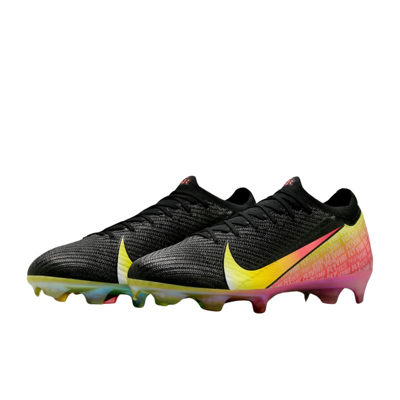 A chuteira Nike Mercurial Vapor 16 Elite FG Vini Jr. Masculina foi criada para jogadores que buscam velocidade, precisão e resposta imediata em campo. Inspirado na trajetória de Vini Jr., o design gradiente combina as cores do seu clube de estreia e da seleção brasileira, representando sua evolução no futebol. A nova placa com padrão de tração em forma de onda trabalha em sinergia com a unidade Zoom Air para proporcionar aceleração explosiva e aderência ideal em gramados naturais. O cabedal é formado pela união do material Nike Gripknit, que garante toque preciso e controle em qualquer condição climática, com o Flyknit, que envolve o pé como uma meia, entregando ajuste firme e conforto imediato. Esta versão apresenta o cabedal Mercurial mais fino já criado, otimizando a sensibilidade com a bola e reduzindo o tempo de adaptação. A chuteira inclui bolsa especial e é recomendada para gramados curtos levemente úmidos.