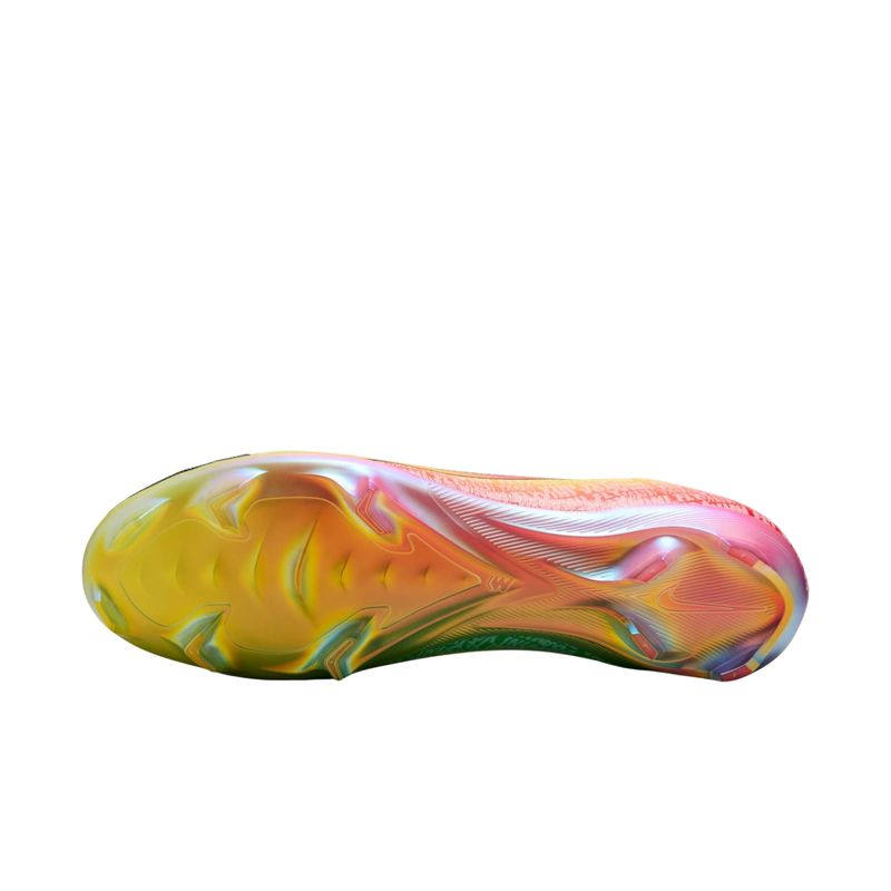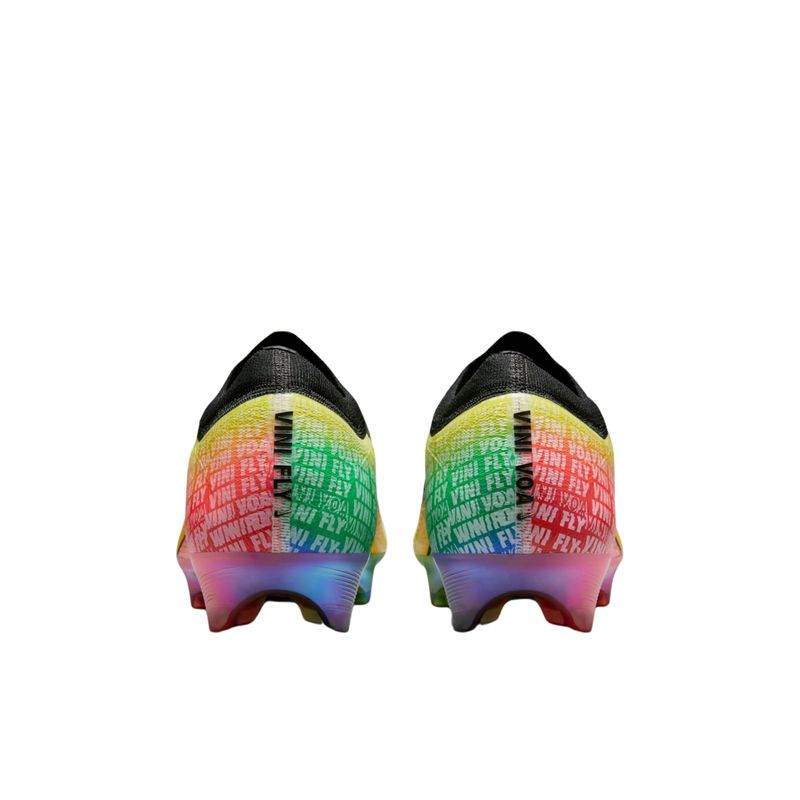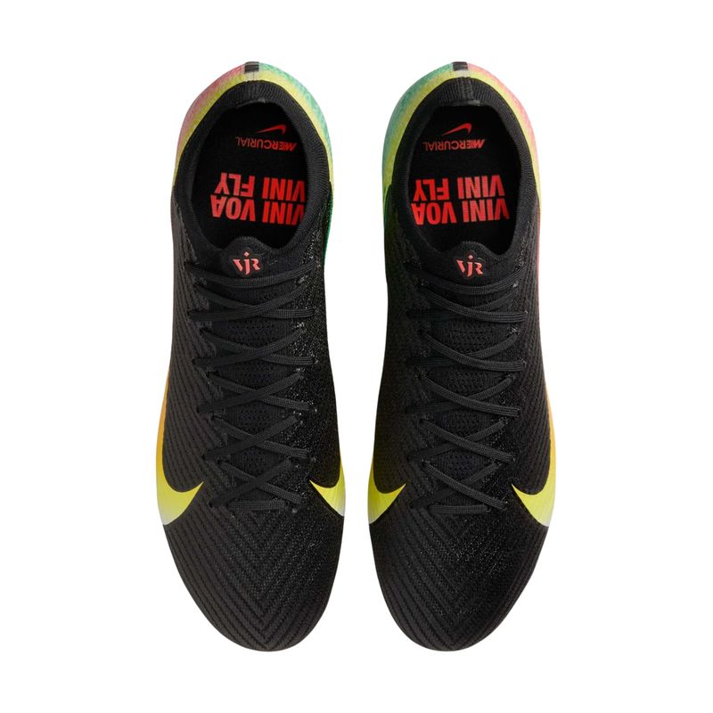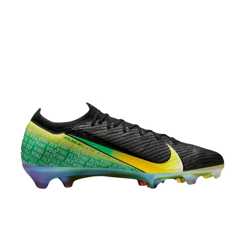 A chuteira Nike Mercurial Vapor 16 Elite FG Vini Jr. Masculina foi criada para jogadores que buscam velocidade, precisão e resposta imediata em campo. Inspirado na trajetória de Vini Jr., o design gradiente combina as cores do seu clube de estreia e da seleção brasileira, representando sua evolução no futebol. A nova placa com padrão de tração em forma de onda trabalha em sinergia com a unidade Zoom Air para proporcionar aceleração explosiva e aderência ideal em gramados naturais. O cabedal é formado pela união do material Nike Gripknit, que garante toque preciso e controle em qualquer condição climática, com o Flyknit, que envolve o pé como uma meia, entregando ajuste firme e conforto imediato. Esta versão apresenta o cabedal Mercurial mais fino já criado, otimizando a sensibilidade com a bola e reduzindo o tempo de adaptação. A chuteira inclui bolsa especial e é recomendada para gramados curtos levemente úmidos.