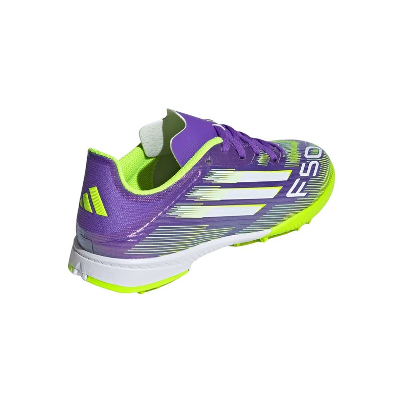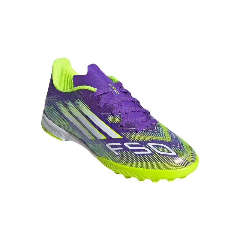 A chuteira F50 League Society Infantil da adidas foi desenvolvida para jovens atletas que buscam velocidade e desempenho em campos de grama artificial. Com design moderno e marcante, o modelo traz o cabedal em Fiberskin com a exclusiva estampa Sprintgrid, oferecendo visual arrojado aliado a estrutura leve e resistente. A língua perfurada favorece a ventilação interna, contribuindo para mais conforto térmico durante as partidas. Seu solado de borracha sulcado é otimizado para garantir tração e estabilidade em gramados sintéticos, proporcionando movimentação precisa e controle mesmo em alta velocidade. A forma padrão e o fecho em cadarço asseguram ajuste firme e seguro, essencial para a performance infantil em partidas intensas. A F50 League Society é uma chuteira pensada para acelerar o jogo, com tecnologias que estimulam a expressão individual e a performance em cada lance.